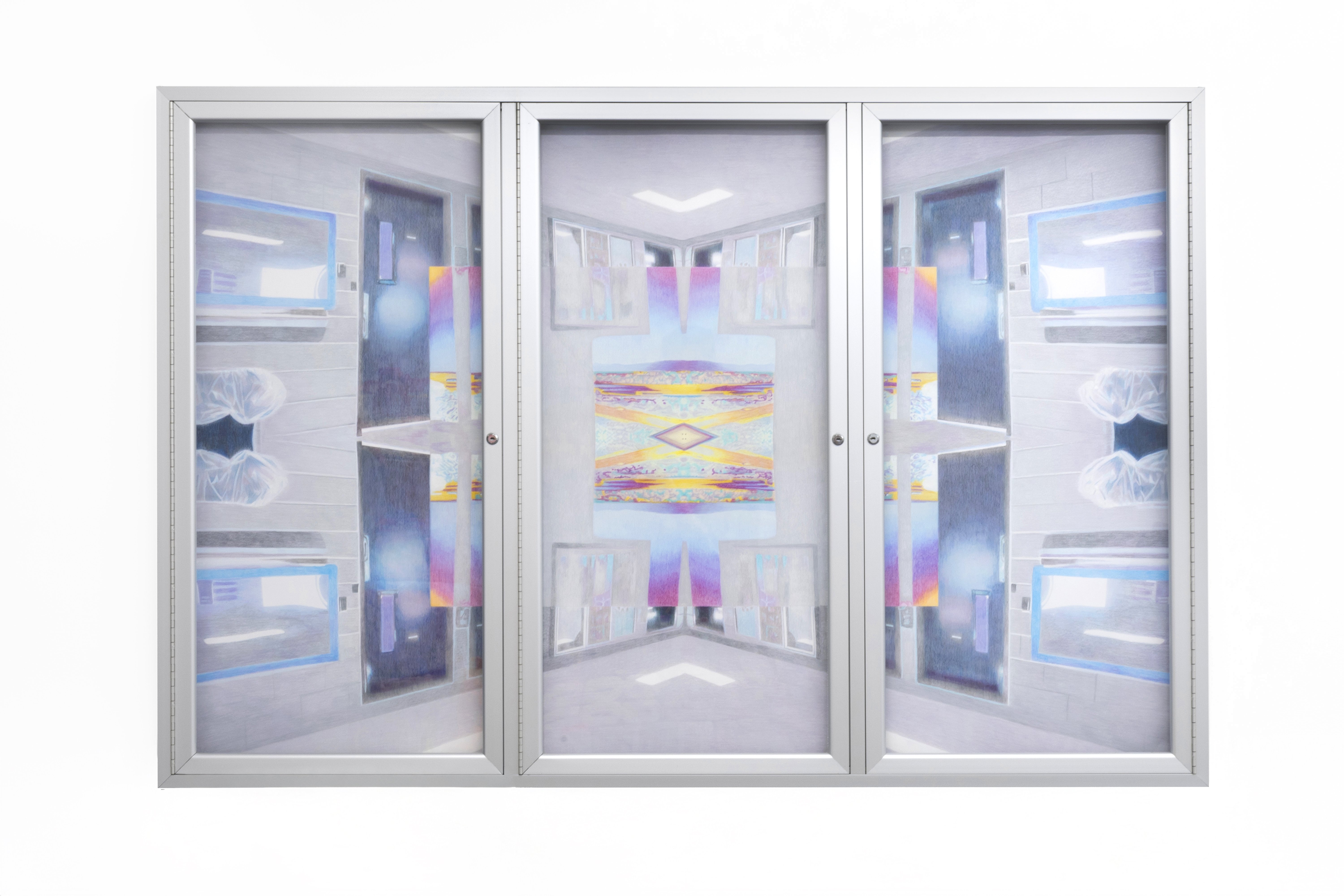 colored pencil on glassine, aluminum tamperproof bulletin display case
